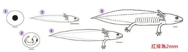 上圖是六角恐龍的成長示意圖,從卵到成體。在每個圖案下的红線代表2 mm。